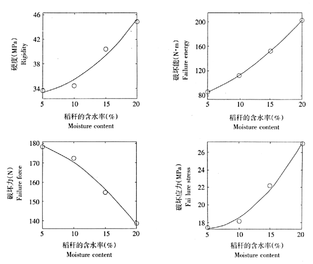 測定和研究稻草秸稈中的機械特性可以為其機械加工設計提供理論參數,東北農業大學的孫占峰和華南農業大學的蔣恩臣使用萬能試驗機對稻草秸稈進行了壓縮、彎曲和剪切試驗。試驗包括橫向壓縮、軸向壓縮和剪切試驗、彎曲試驗三大類。其中分別對根部莖稈、下部節莖稈、中部莖稈、上部節莖稈、稍部莖稈進行測試和數據處理。試樣的物理特性參數包括外徑、內徑、橫斷面面積、含水率等。試驗中試樣的變形范圍為0~10 mm,力的變化范圍為0~100 N。通過計算機自動采集數據可直接得出力-變形曲線。作者在較后通過多項式回歸還分析建立了稻草秸稈的擠壓、彎曲和剪切力學指標隨含水率變化關系的數學模型。